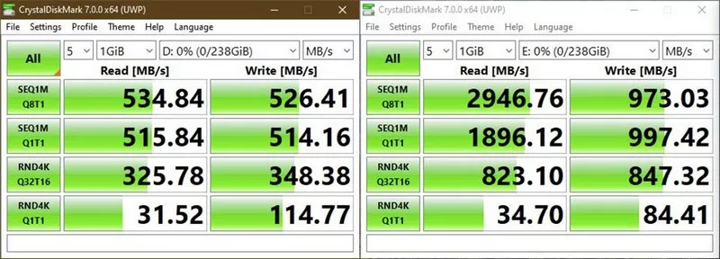 This is the benchmark speed with CrystalDisk of the two Micron drives I usually use for the demo. On the left is the Micron 1300 2.5 SATA SSD and on the right is the Micron 2200 M.2 PCIe 3.0 x4 NVMe SSD. You can see that the SATA SSD will not be able to reach access speeds above 600 MB/s while M.2 PCIe drives like the Micron 2200 - a line of drives that are not too performance-oriented could easily achieve sequential read speeds at 3000 MB/s and sequential writes of nearly 1000 MB/s.