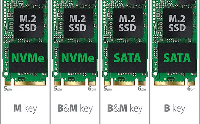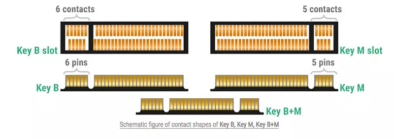 • M.2 PCIe 3.0 x2 and M.2 SATA SSDs will have a B&M Key pin design with 2 groups of batteries on the outside, a group of 5 and a group of 6 pin.